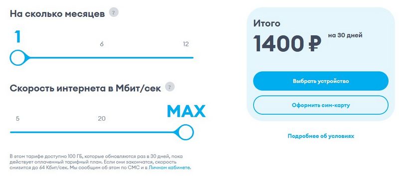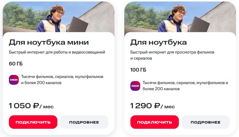 Есть два тарифа: «Для ноутбука мини» (60 Гб, 1050 руб./мес) и «Для ноутбука» (100 Гб, 1 290 руб./мес).