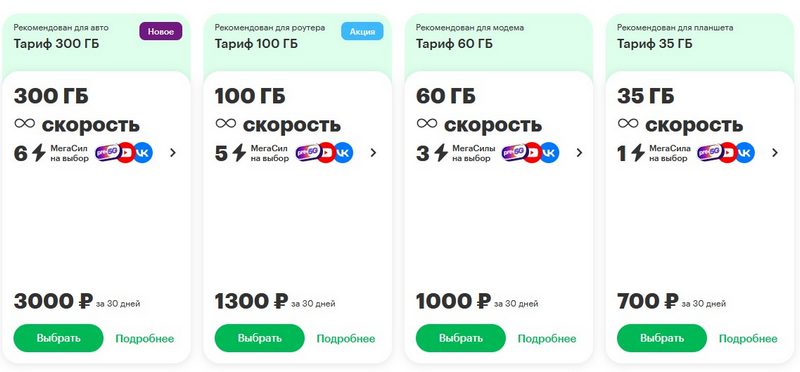 Доступны четыре тарифа: «Тариф 35 Гб» (700 руб./мес), «Тариф 60 Гб» (1000 руб./мес), «Тариф 100 Гб» (1300 руб./мес), «Тариф 300 Гб» (3000 руб./мес).
