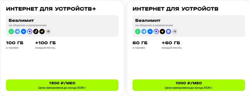 Тарифы: «Интернет для устройств мини» (35 Гб, 700 руб./мес.), «Интернет для устройств» (60 Гб, 1000 руб./мес.) и «Интернет для устройств+» (100 Гб, 1300 руб./мес.).